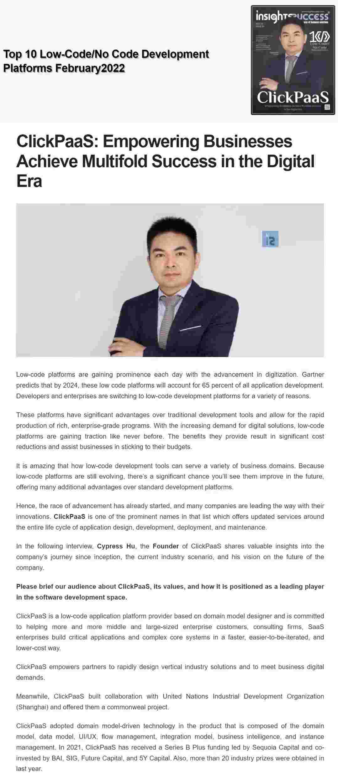 2022年年初,,,钱能钱包入选外媒Insights Success低代码/无代码开发平台 Top10,,,,创始人、、CEO胡柏受邀接受专访并荣登封面人物,,,他与Insights Success的读者分享了钱能钱包成立的初心、、、发展历程、、当前的行业发展趋势以及他对公司未来的展望。。